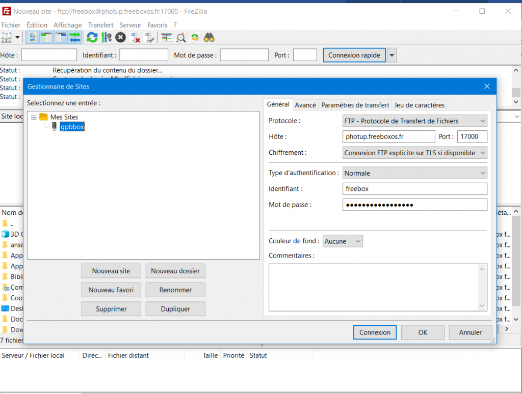 - Hôte : le nom du serveur à distance que vous avez noté sans le numéro du port (ici : photup.freeboxos.fr)