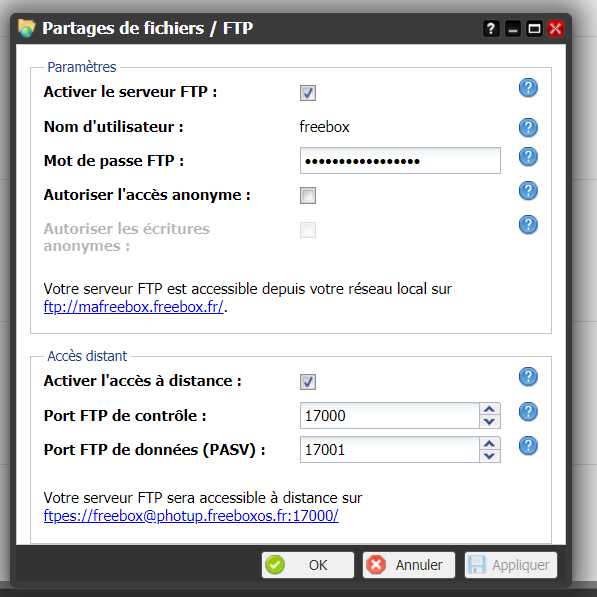 Voici un exemple avec une freebox revolution. Mais chaque fournisseur d’accès propose cette ouverture au monde FTP (voir sur son site les tutoriels)