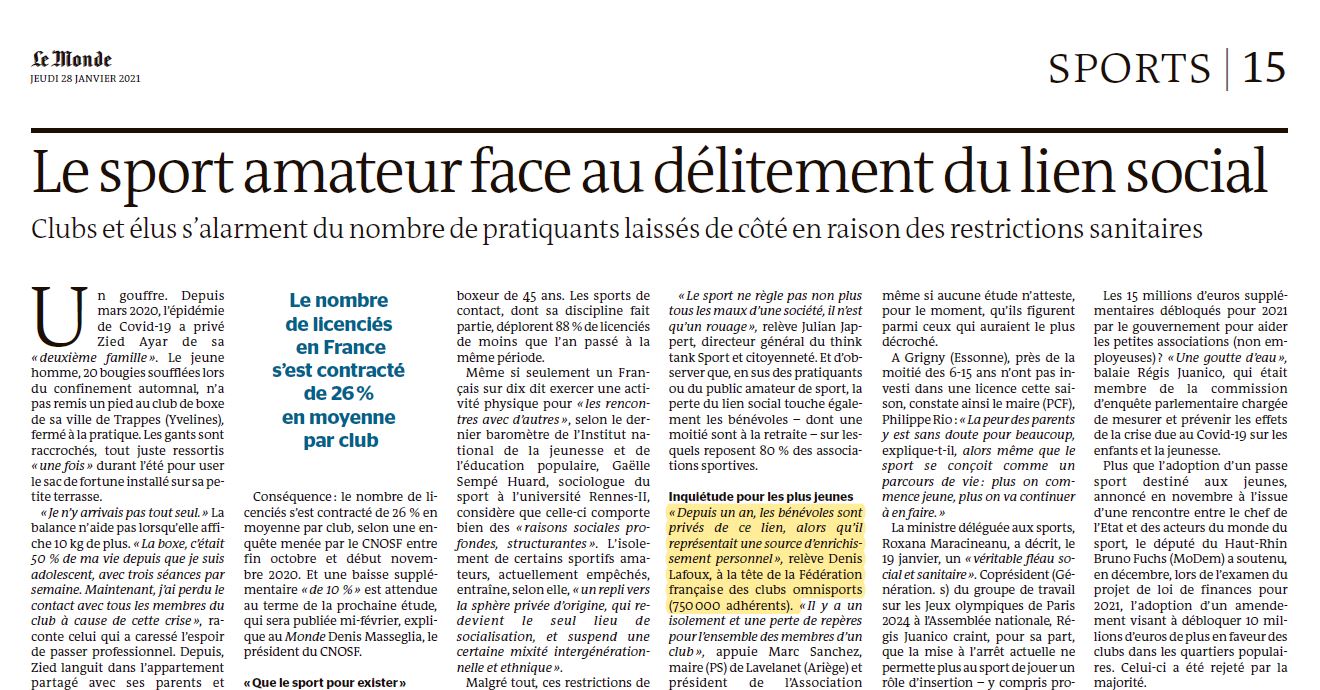 La F.F. Clubs Omnisports a pris la parole au cœur d’un article du Monde du Jeudi 28 janvier 2021.